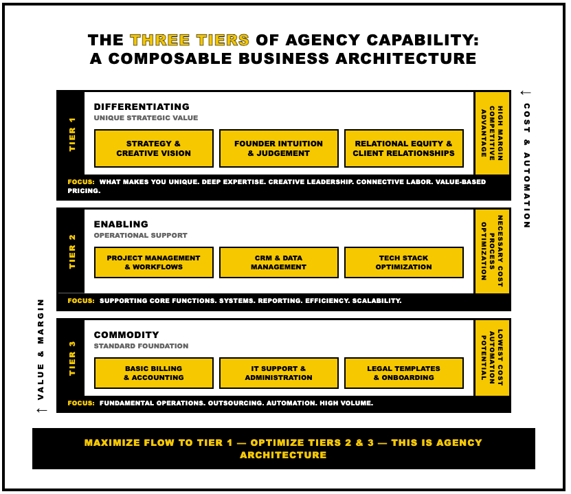 Here's the problem: most agencies invest their founder's time, their best people, and their tightest margins in Tier 2 and Tier 3. The enabling and commodity work eats up 60-70% of the capacity, while the differentiating capability, the actual reason clients pay premium rates, gets squeezed into whatever time is left after the operational machine has been fed.